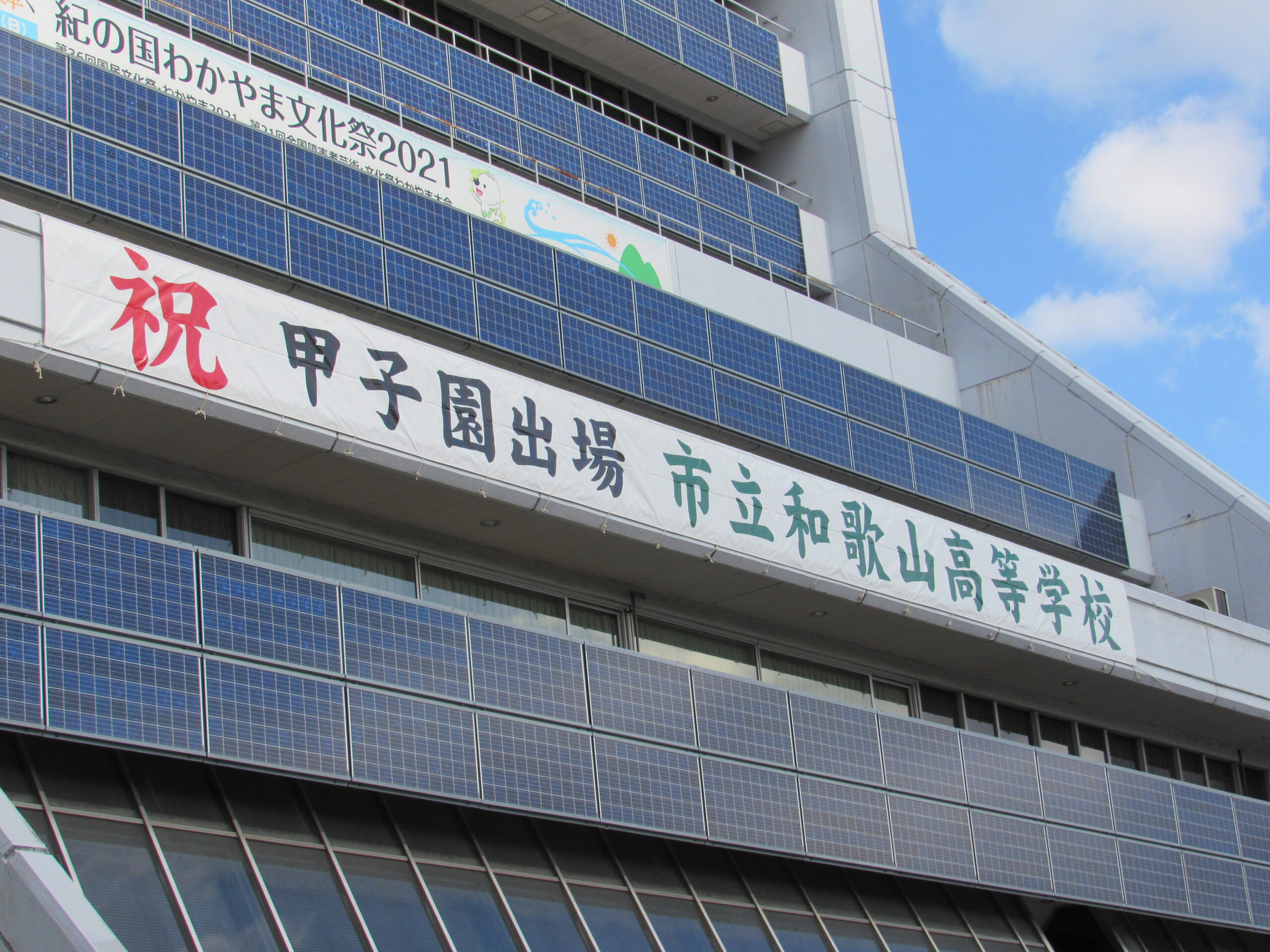 和歌山市役所に市立和歌山の選抜大会出場を祝う横断幕