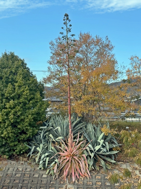 善明寺のリュウゼツランは、鳴滝川の土手の斜面に数年前から自生していて、根元から生える沢山の枝のうちの数本が、高さ7メートルほどまっすぐに伸びて、分かれた枝先に葉が茂っています。