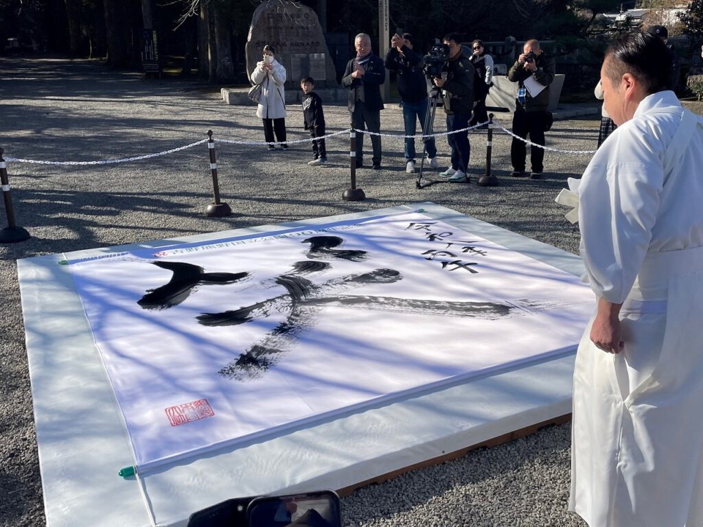 大筆書きは、2008年から続く、年末恒例の行事で、新年がこうあってほしいと期待する漢字を宮司が選んで書き上げています。
