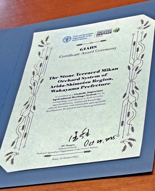 去年(2025年)10月、和歌山県の「有田・下津(ありだ・しもつ)地域の石積み階段園みかんシステムが、FAO・国連食糧農業機関から世界農業遺産に認定されたことを受け、地元で登録に向けた支援活動を繰り広げてきた推進協議会の会長らが、きょう(1月6日)和歌山県庁を訪れ、宮﨑泉(みやざき・いずみ)知事に認定証を持って報告しました。