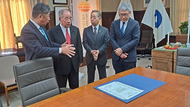 宮﨑知事を表敬訪問したのは、有田・下津地域世界農業遺産推進協議会の会長でJAわかやまの森田耕司(もりた・こうじ)理事や、副会長で有田市の玉木久登(たまき・ひさと)市長、顧問で和歌山県議会の尾崎要二(おざき・ようじ)議員です。3人は、世界農業遺産の認定証を宮﨑知事に見せて、改めて世界農業遺産認定を報告しました。