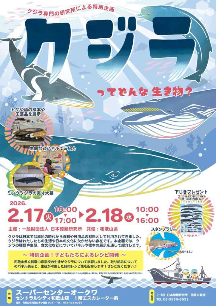 日本人とクジラとの関わりや、歴史や食を通じた捕鯨文化を紹介する企画展が、きょう(17日)とあす(18日)、和歌山市のスーパーセンターオークワセントラルシティ和歌山店で開かれています。