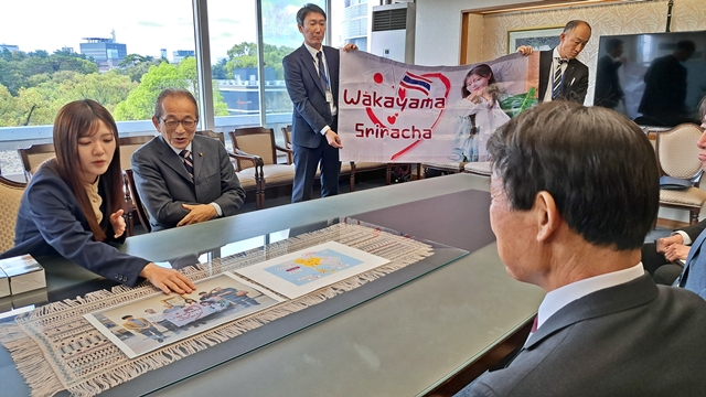 中井さんから「現地では、和歌山ラーメンや和歌山城の関心が高かった」などと報告を受けた尾花市長は「和歌山市はタイからの観光客も多いので、ますます市のPRに力を貸して欲しい」と答え、中井さんの活躍に期待を寄せました。