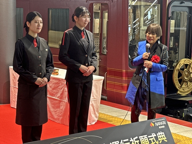 きょう正午過ぎ、GRAN天空専用となるなんば駅0番線ホームで行われた式典には、南海電鉄の遠北光彦(あちきた・てるひこ)会長と梶谷知志(かじたに・さとし)社長、それに、岸和田市出身の世界的デザイナーでGRAN天空のアテンダントの制服をデザインしたコシノジュンコさんらが出席し、今川宗務総長らが読経するなか、安全運行を祈りました。