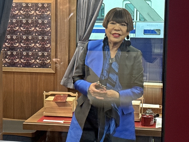 また、コシノジュンコさんもあいさつに立ち、パンツスタイルでダークグレーのジャケットに、胸元の深紅を合わせたの制服のコンセプトについて「動く列車内での接客を想定して、安全で動きやすい機能性を重視しました。キリッとしてスポーティーな着こなしで、明るく働くことでおもてなしを提供できれば」と説明しました。