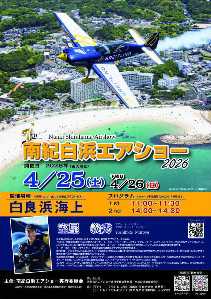 そして、南紀白浜エアショーが、室屋さんにとって、今年初のフライトパフォーマンスとなるということで、ビーチならではの開放感の中で、エンジン音や想像を超える飛行機の動きを含めた立体的なパフォーマンスを体感してほしいとしています。