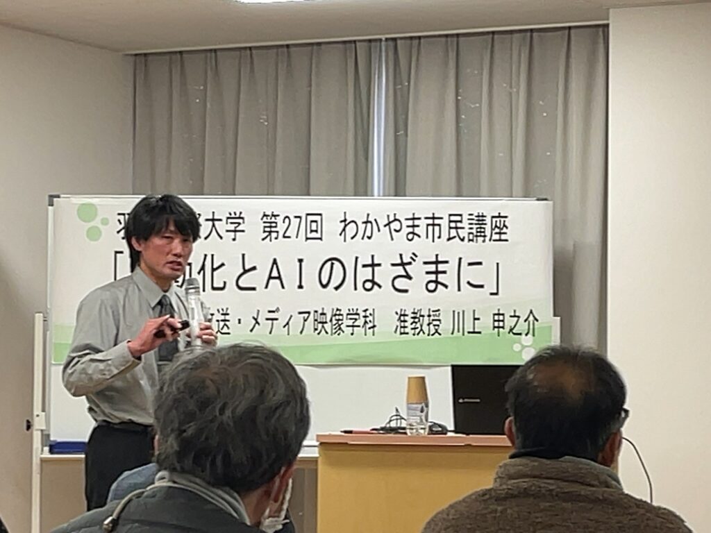 きょう午後2時から、和歌山市美園町のけやきONE(ワン)ビルで開かれた市民講座では、現代社会学部 放送・メディア映像学科の川上申之介(かわかみしんのすけ)准教授が、「自動化とAIのはざまに」と題して講演し、16人の市民が受講しました。