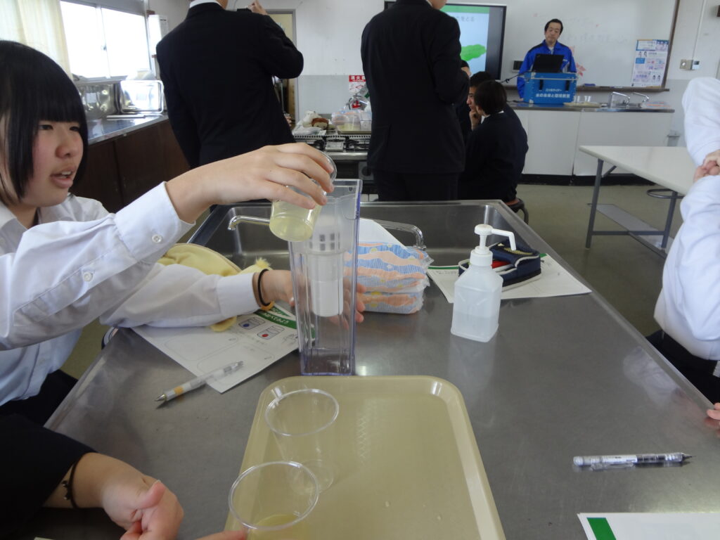 授業では、アサヒ飲料が自社で取り組む森づくり活動を紹介したあと、生徒たちが、地元「富田の水」と自社製品の「アサヒ おいしい水 天然水 六甲」それに海外の硬水の3種類を飲み比べ、それぞれ味の違いを確かめていました。